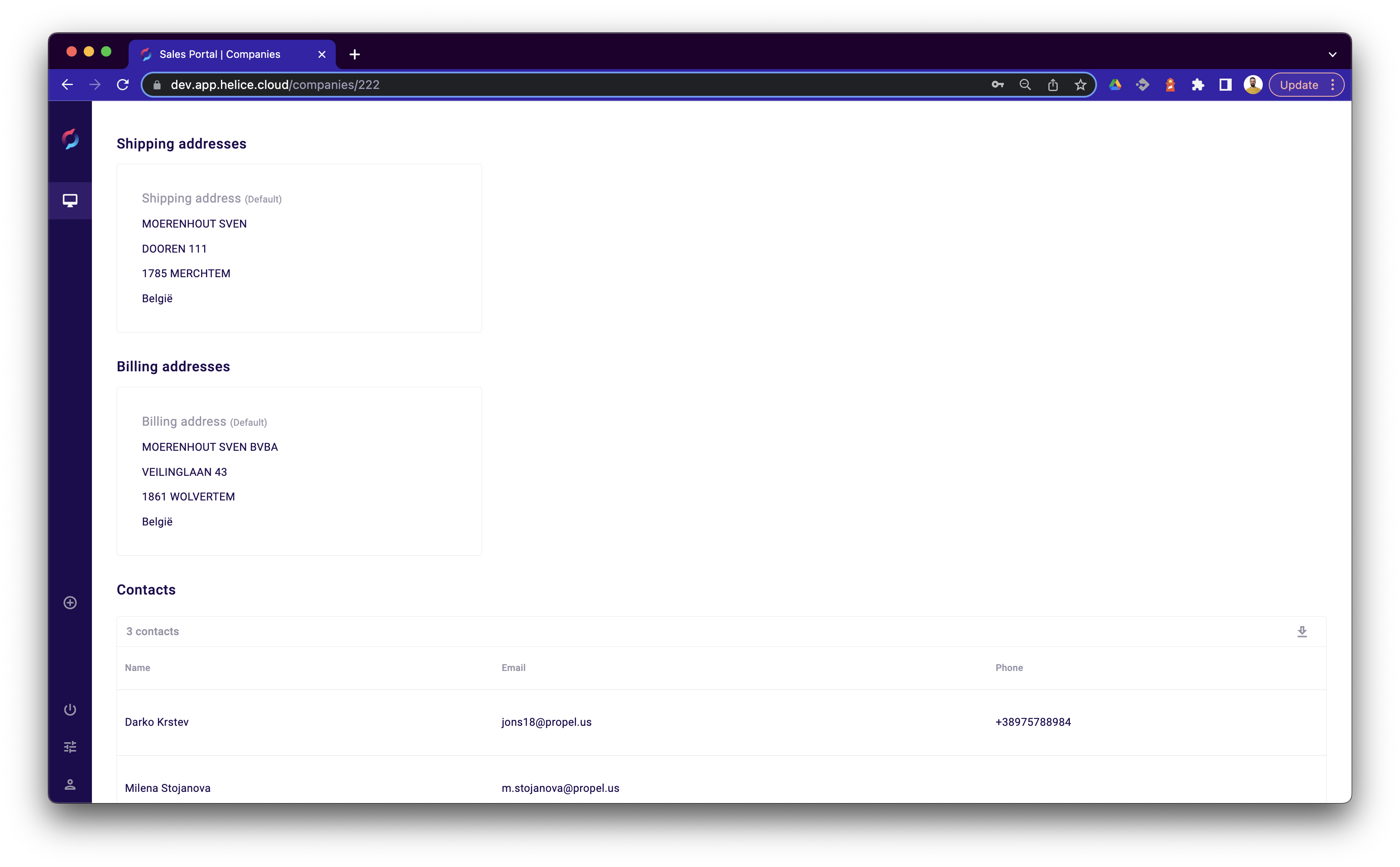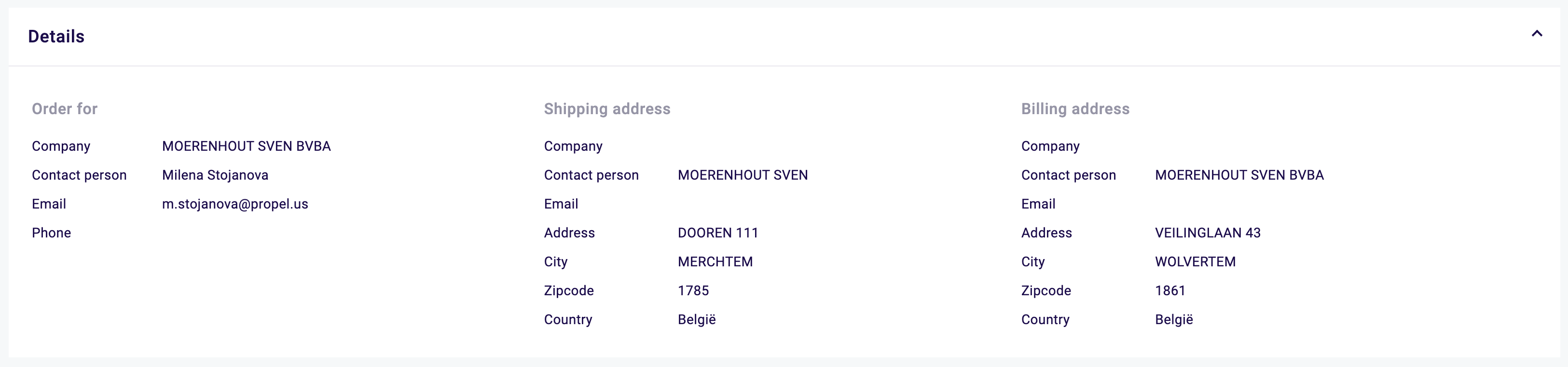 The details allows you to select a Company and Contact for the Quotation / Order. Once selected, the portal populates the Shipping and Billing details with the default values that can be changed to any of the saved addresses for the Contact.
