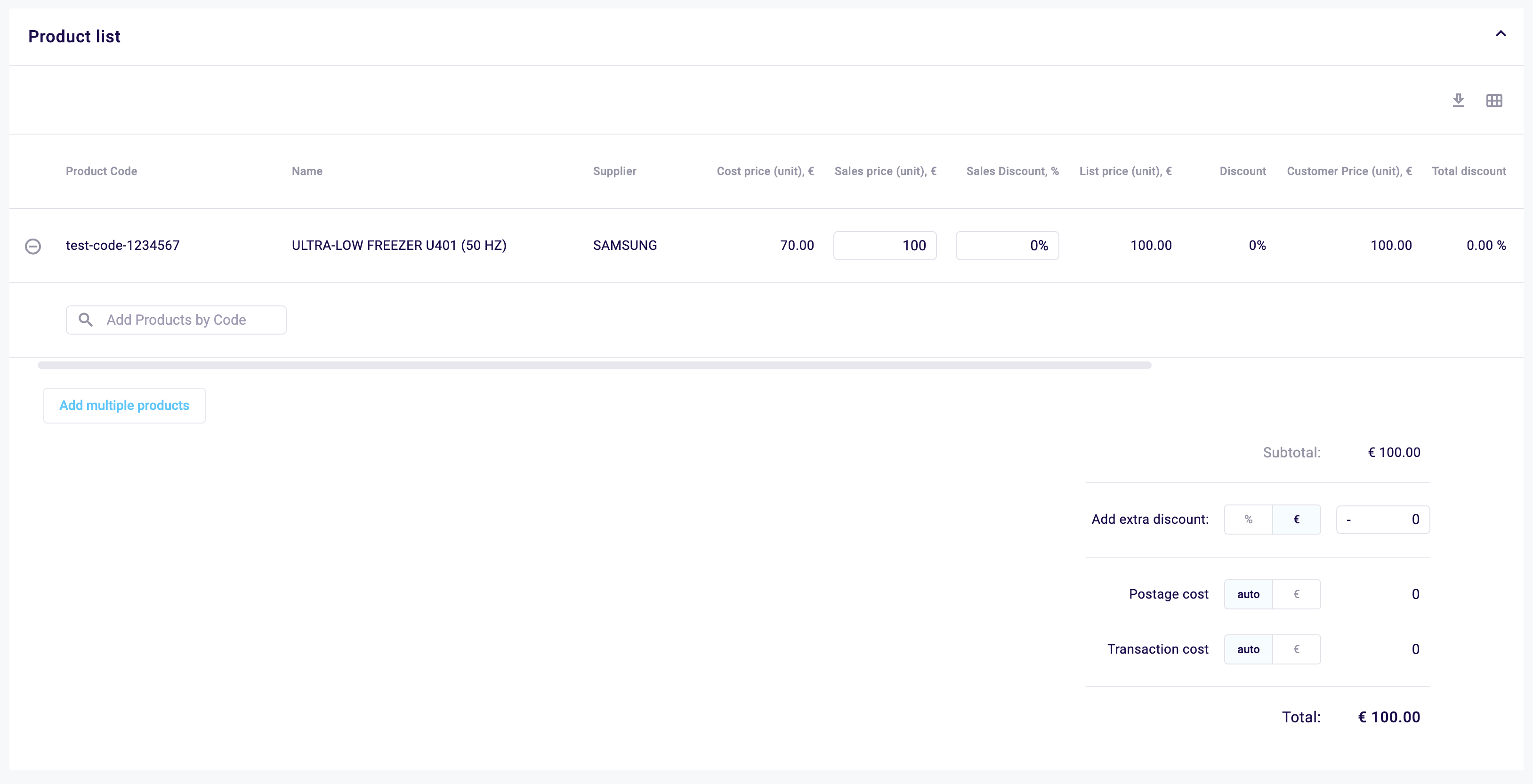 You can add products to the Quotation / Order either by entering the specific product code, or by using the Add Multiple Products dialog.